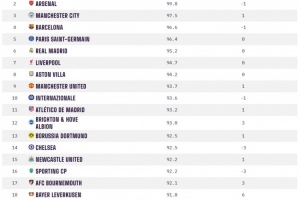 OPTA全球俱乐部实力榜:拜仁、阿森纳、曼城、巴萨以及巴黎居前5